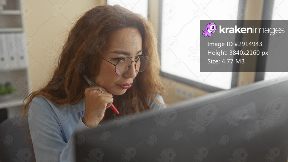 Woman in glasses holding a red pen with hand on chin looking at computer monitor in an office building; thinking.