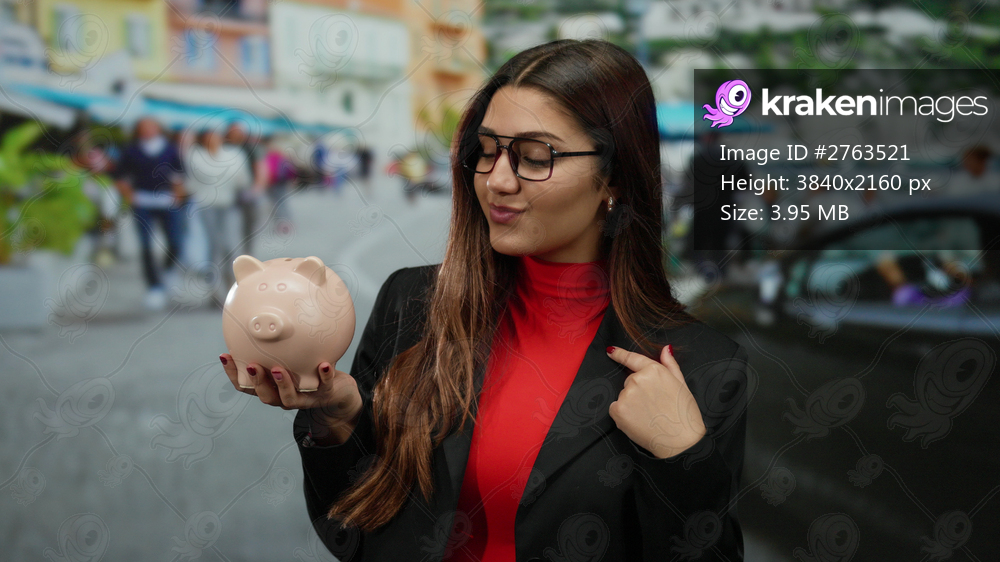 Woman in glasses holding piggy bank while pointing at herself on a bustling street with an urban european backdrop suggests personal savings and confidence outdoors. - Kraken Images