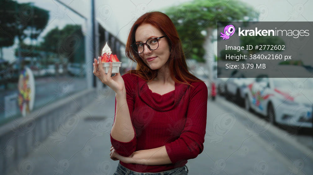 Woman in glasses with ice cream stands on city street wearing red sweater reflecting urban outdoor scene