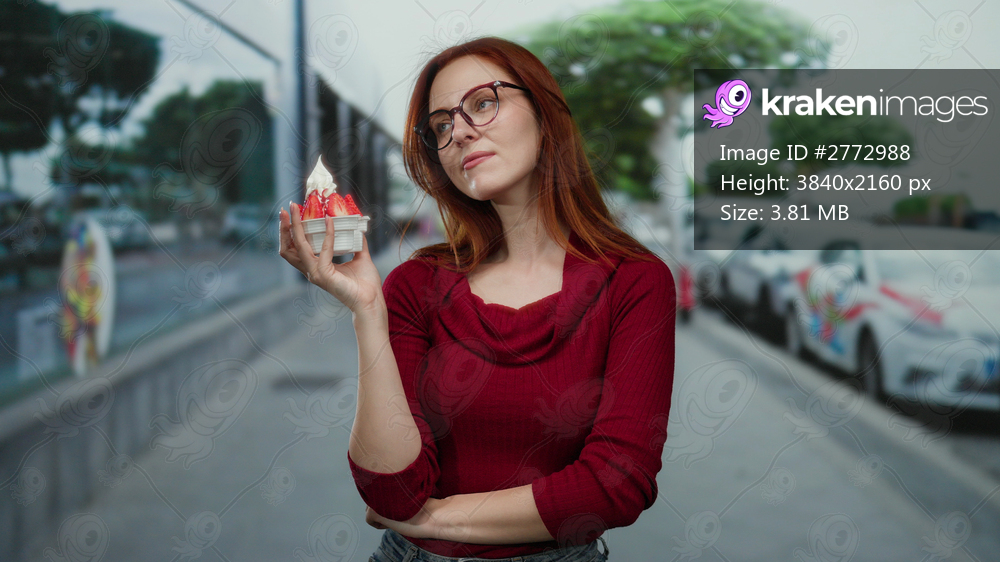 Woman in glasses with ice cream stands on city street wearing red sweater reflecting urban outdoor scene