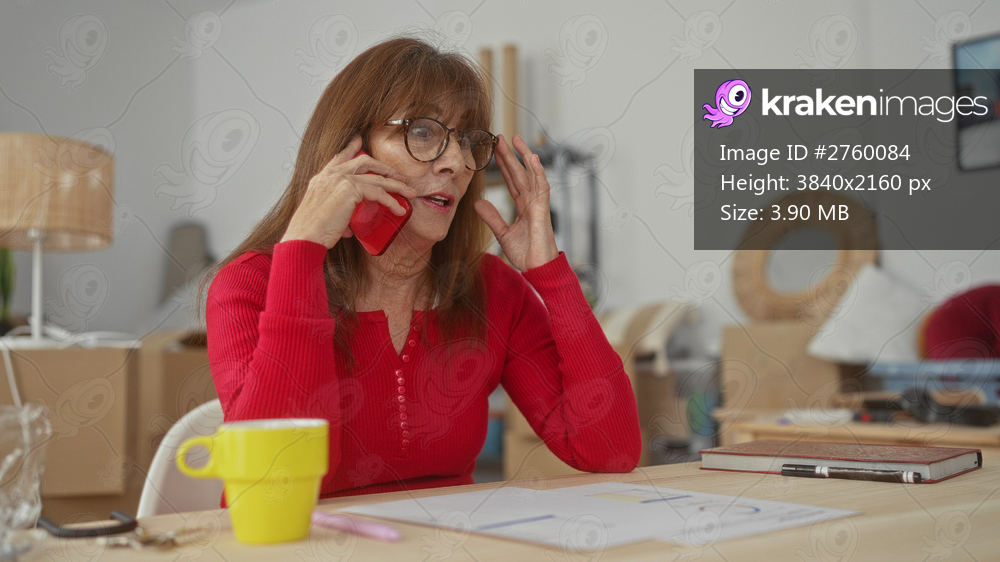 Woman in glasses with phone and cup in modern living room, unpacking boxes, reviewing documents, expressing surprise and anticipation for new home.