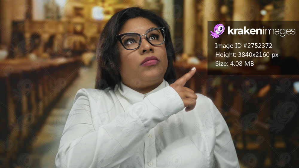 Woman in glasses pointing up in a church setting shows a thoughtful expression in a religious atmosphere, highlighting her plus size and hispanic background. - Kraken Images