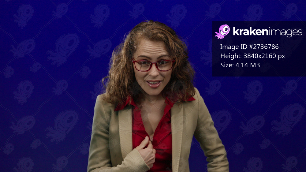 Woman in glasses and red blouse with beige jacket standing against blue background displaying various expressions under studio lighting.