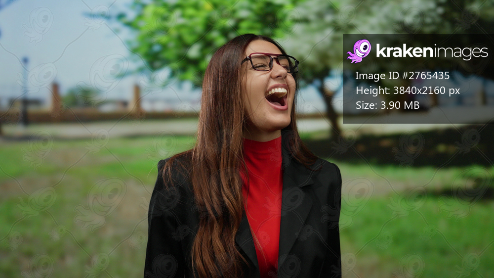Woman in glasses smiling and shouting in a park, dressed in a red top and black blazer, expressing joy on a sunny day surrounded by trees.