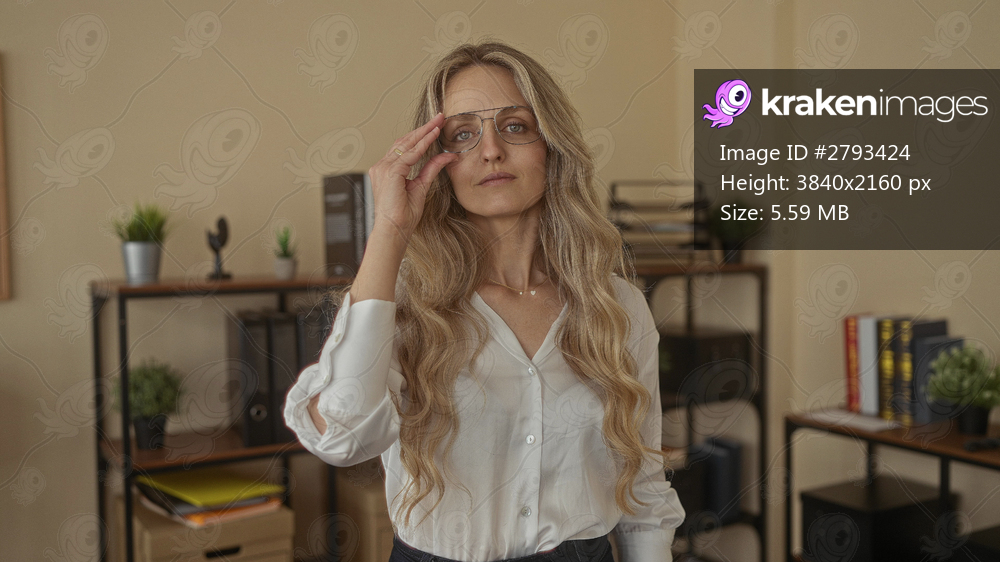 Woman in glasses standing confidently in an office environment with bookshelves and plants, exuding professionalism and confidence in her workplace setting. - Kraken Images