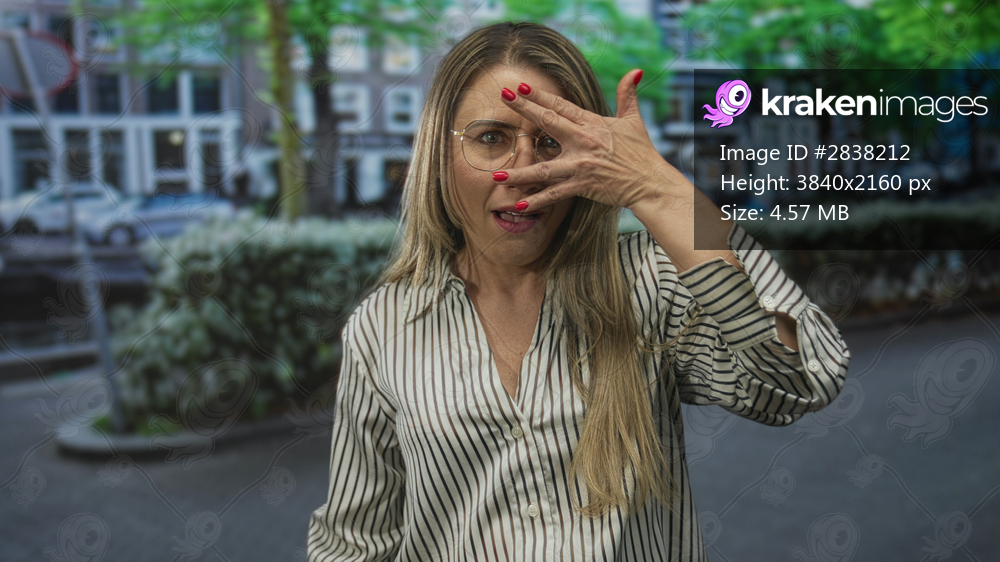 Woman in glasses and striped shirt covers face with hand showing red nails on busy city street; playful curiosity.