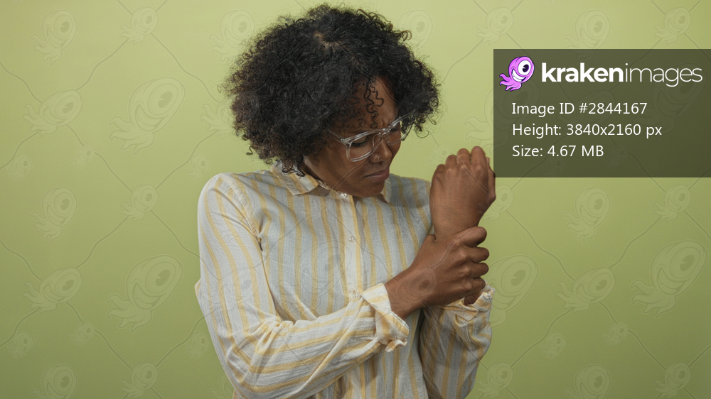 Woman in glasses and striped shirt grasps her wrist with furrowed brow against pale green studio wall; discomfort.
