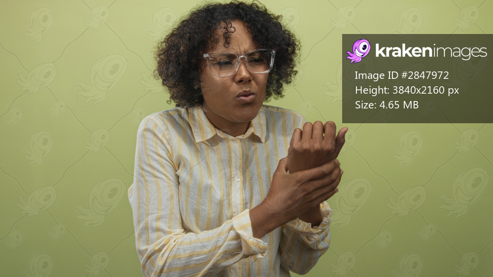 Woman in glasses and striped shirt grasps her wrist with furrowed brow against pale green studio wall; discomfort.