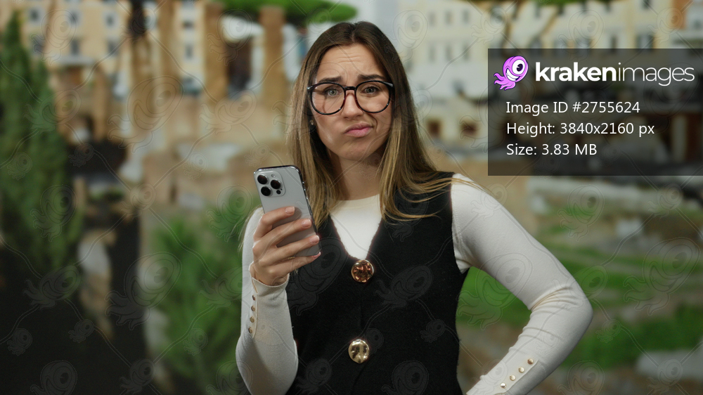 Woman in glasses using smartphone at roman ruins outdoor in rome, showing puzzled expression, showcasing blend of ancient history and modern technology. - Kraken Images