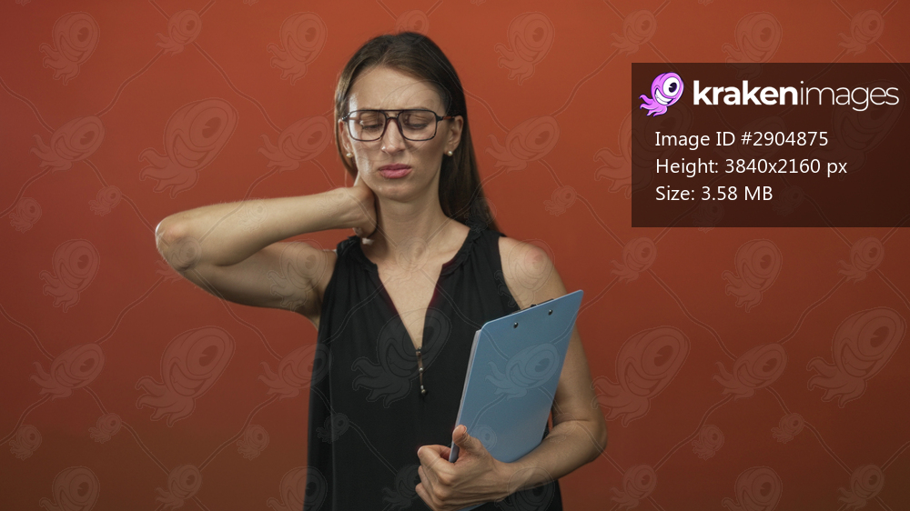 Woman in glasses wearing sleeveless black top holding blue clipboard, hand on neck and wincing in orange studio; discomfort.
