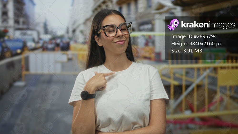 Woman in glasses wearing white t shirt and smartwatch, hand to chest and finger pointing to herself on street near construction barriers; self pride.