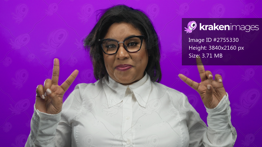 Woman in glasses and white shirt over vibrant purple background gesturing peace sign while smiling confidently
