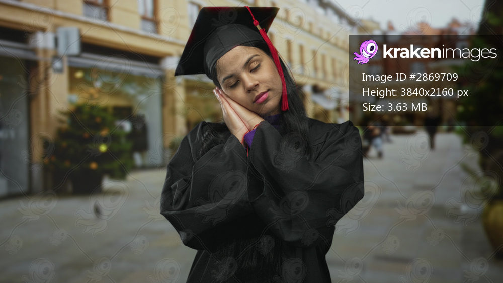 Woman in graduation cap and black gown holds hand to cheek on city street in front of building facades; serenity.