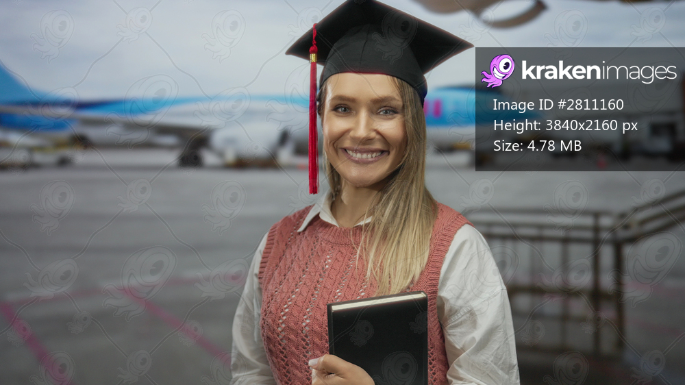 Woman in graduation cap with book smiling at airport with airplane in background, representing success and travel, wearing casual attire, standing confidently showing her achievement. - Kraken Images