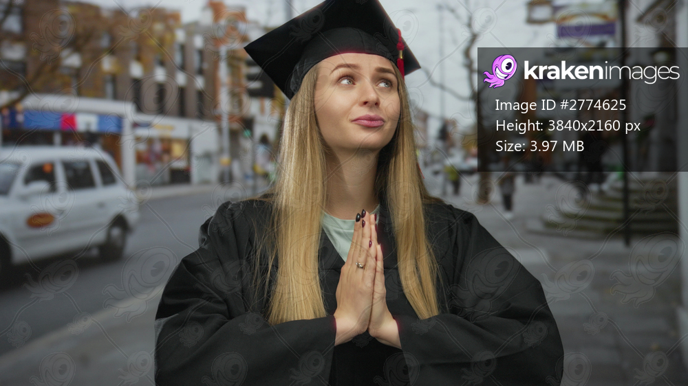 Woman in graduation cap and gown standing outdoors on city street with hands in prayer, surrounded by buildings and taxi, symbolizing hope and future aspirations. - Kraken Images