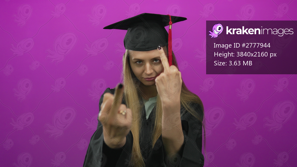 Woman in graduation cap and gown stands against pink background making a bold gesture.