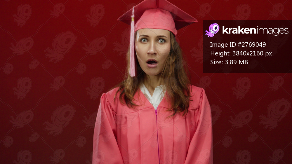 Woman in graduation gown against red background with eyes closed, expressing emotions in various frames, symbolizing a journey of achievement and contemplation. - Kraken Images