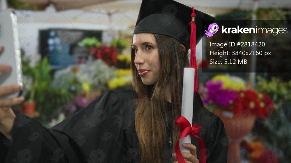Woman in graduation gown holds diploma and scrolls smartphone on street outside flower shop; academic pride.