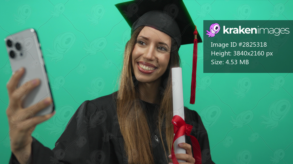 Woman in graduation gown holds smartphone for selfie with diploma and red tassel against green backdrop in studio; pride.