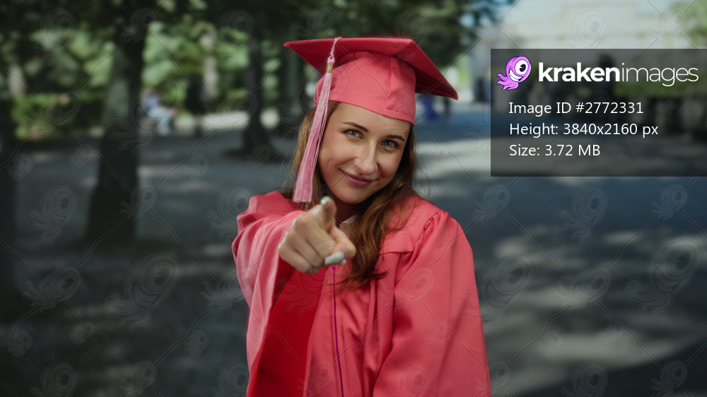 Woman in graduation gown pointing with smile in city street celebrating academic success outside during daytime.