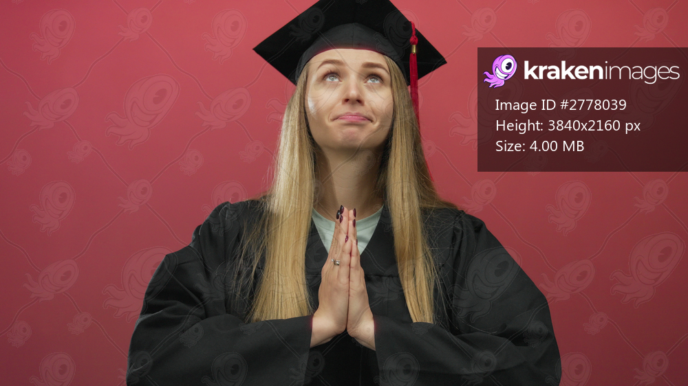 Woman in graduation gown praying against red wall expresses hopeful anticipation with folded hands and thoughtful gaze celebrating academic success and future aspirations. - Kraken Images
