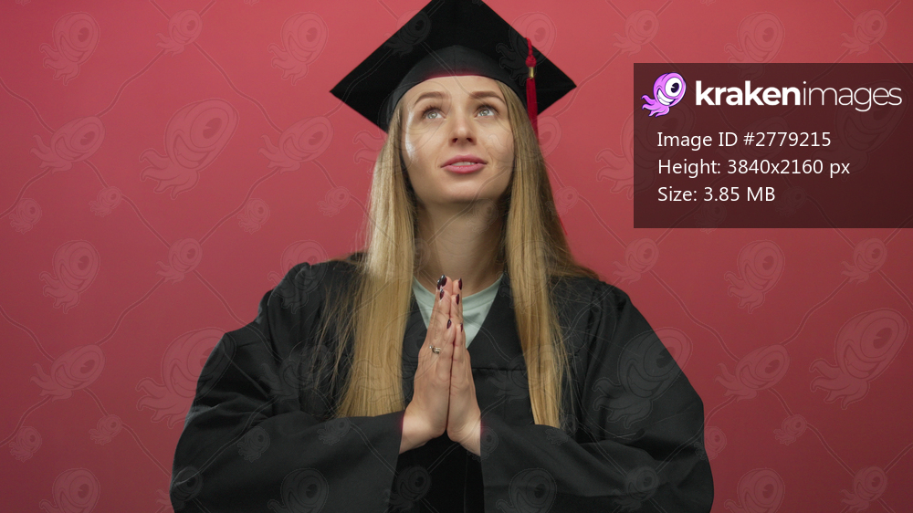 Woman in graduation gown praying against red wall expresses hopeful anticipation with folded hands and thoughtful gaze celebrating academic success and future aspirations. - Kraken Images