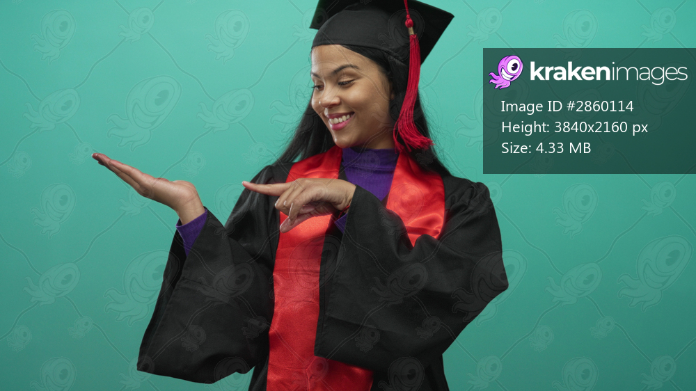 Woman in graduation gown showing open palm with pointing finger in teal studio; pride success accomplishment.