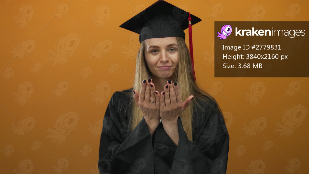 Woman in graduation gown stands smiling against an orange background, displaying palms with hands open.
