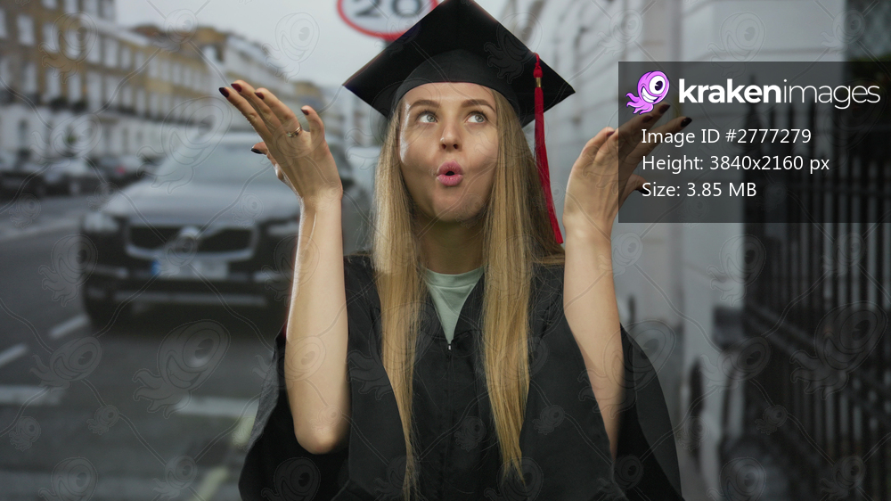 Woman in graduation uniform stands amused on a city street surrounded by cars and buildings, capturing a moment of triumph and surprise.