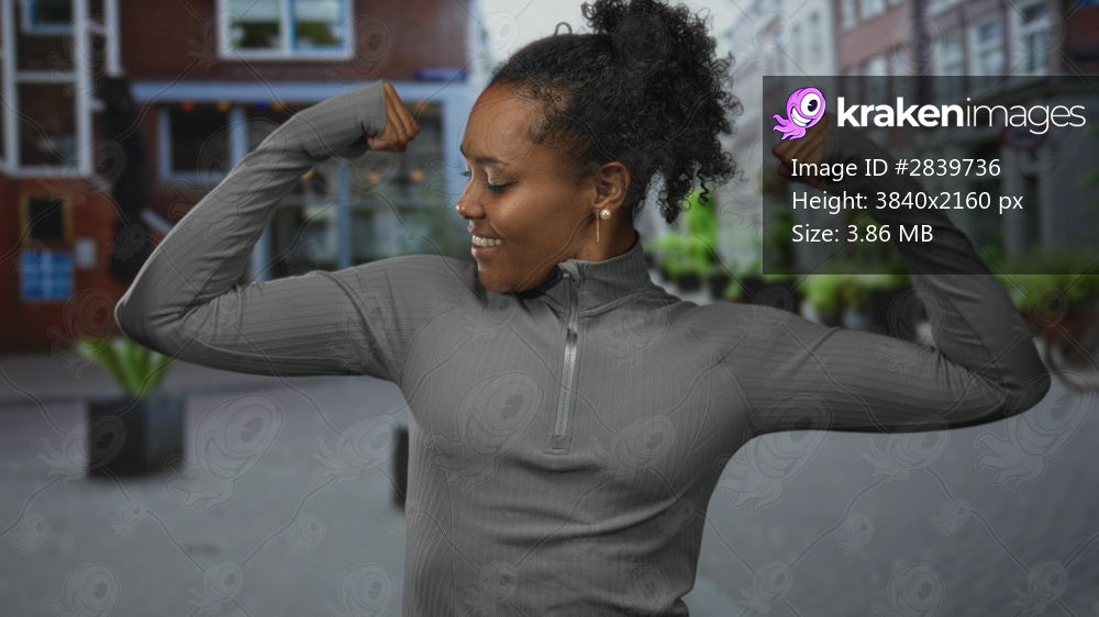 Woman in gray athletic top flexes biceps in front of brick building on street lined with planters; confidence empowerment.
