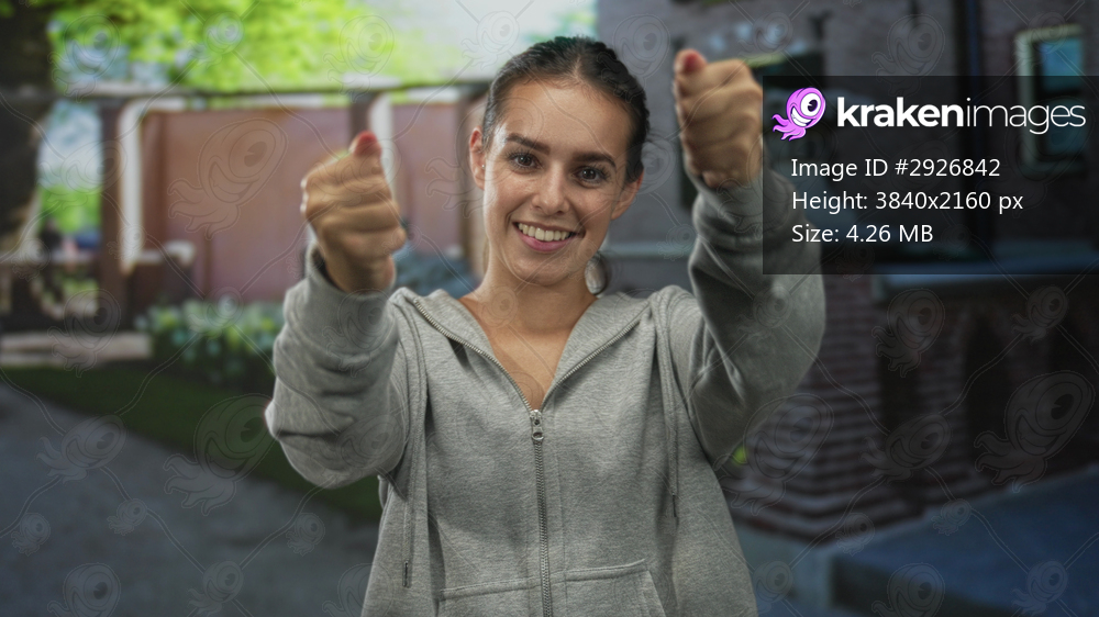 Woman in gray hoodie with hands gripping an imaginary steering wheel, smiling and leaning slightly forward on street; playful confidence.