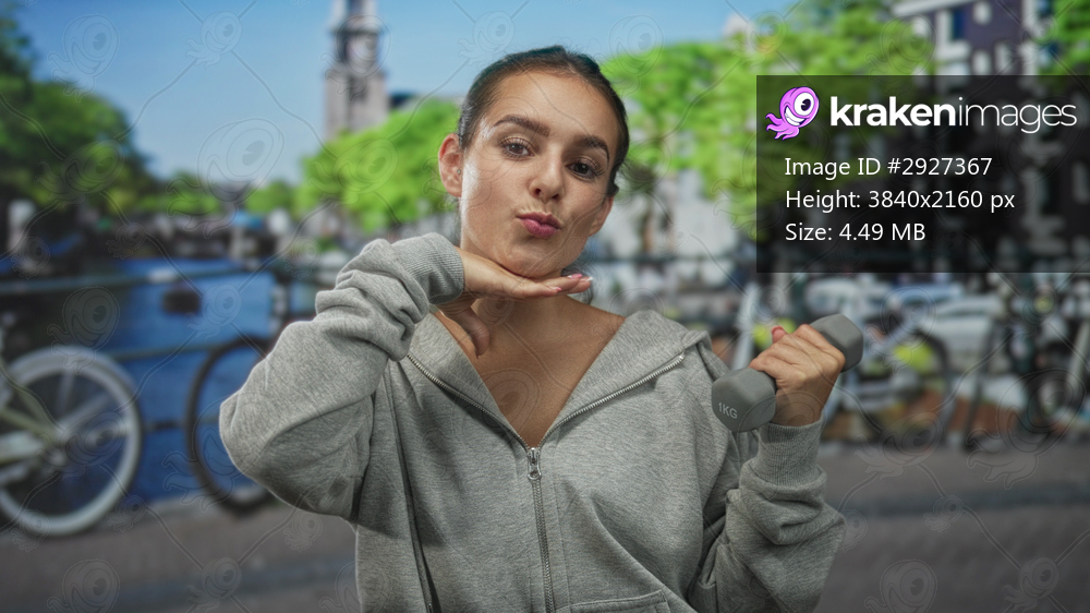 Woman in gray hoodie holding a 1kg dumbbell and making finger heart gesture on a street by a canal in amsterdam; playful fitness.