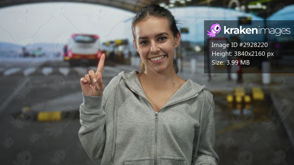 Woman in gray hoodie smiling with eyes closed points finger upward at busy airport departure terminal curbside near shuttle bus; travel optimism.
