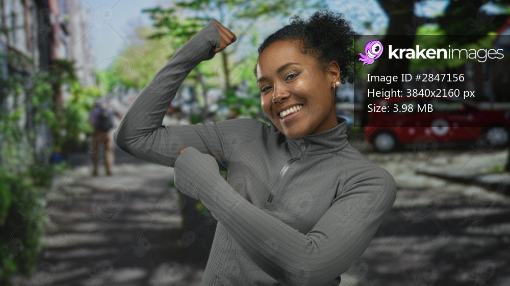 Woman in gray pullover flexes bicep muscle on sunlit street; strength confidence resilience empowerment.