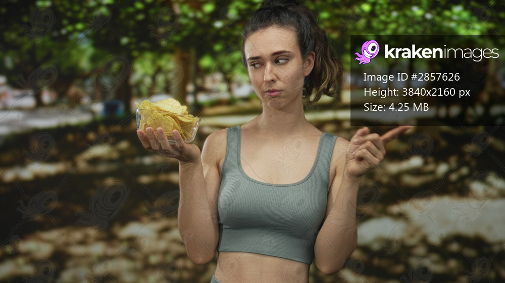 Woman in gray sports bra points finger at bowl of crispy chips in green forest; hesitation craving.