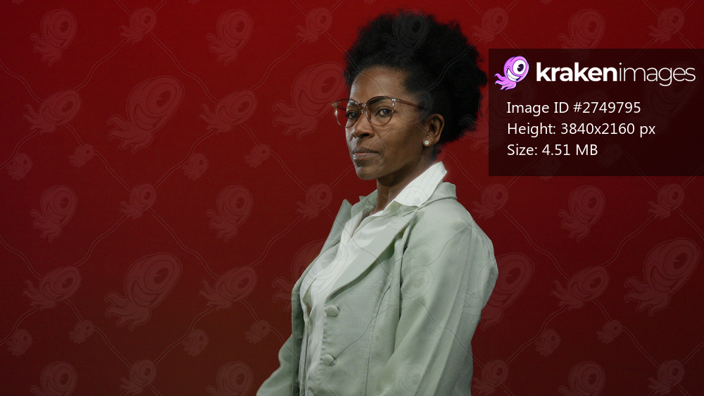 Woman in gray suit extends hands against vibrant red background showcasing confident expression and professional attire.