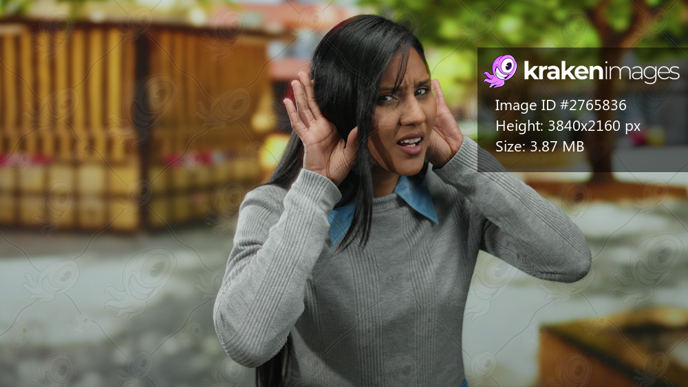 Woman in gray sweater with curious expression listens intently outdoors in a park setting, surrounded by blurred trees and a wooden structure.