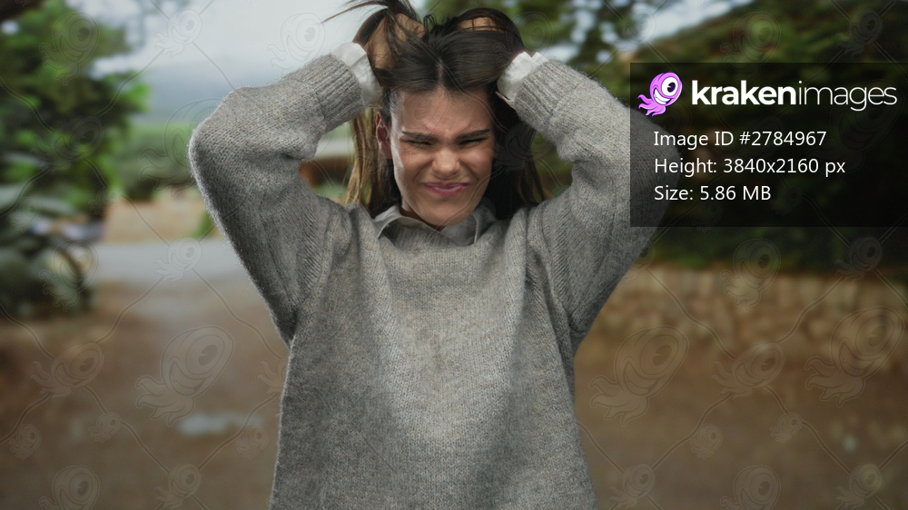 Woman in gray sweater expressing frustration in a park with blurred trees and pathway in the background on a sunny day outdoors.