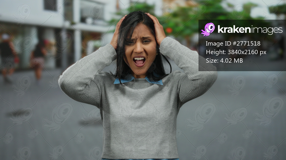 Woman in gray sweater gesturing with frustration on a bustling street, capturing stress and emotion outdoors.