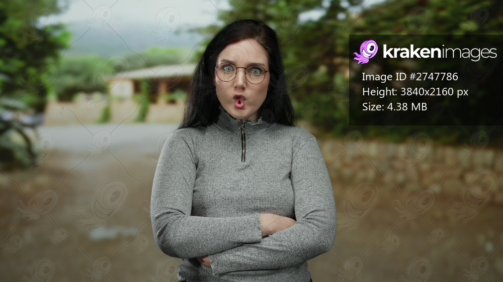 Woman in gray sweater with glasses stands with arms crossed in an old town setting showing a curious expression with blurred greenery and rustic background. - Kraken Images