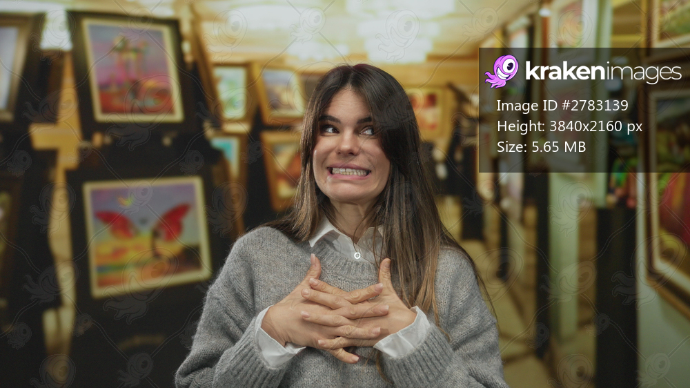 Woman in gray sweater surrounded by colorful art exhibits inside gallery shrugs expressing uncertainty with thoughtful expression and hands raised.