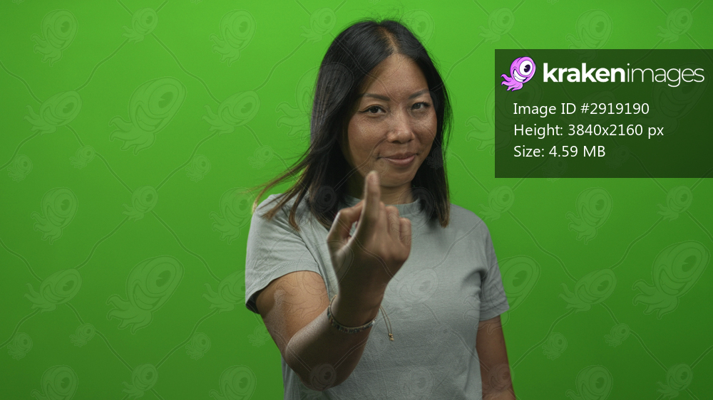 Woman in gray t shirt beckoning with hand toward camera in studio with bright green wall; welcoming gesture.