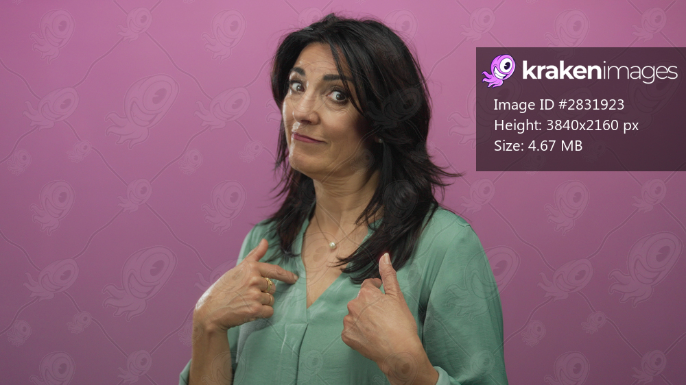 Woman in green blouse points index fingers toward camera in pink studio while making a forbidding look; rejection.