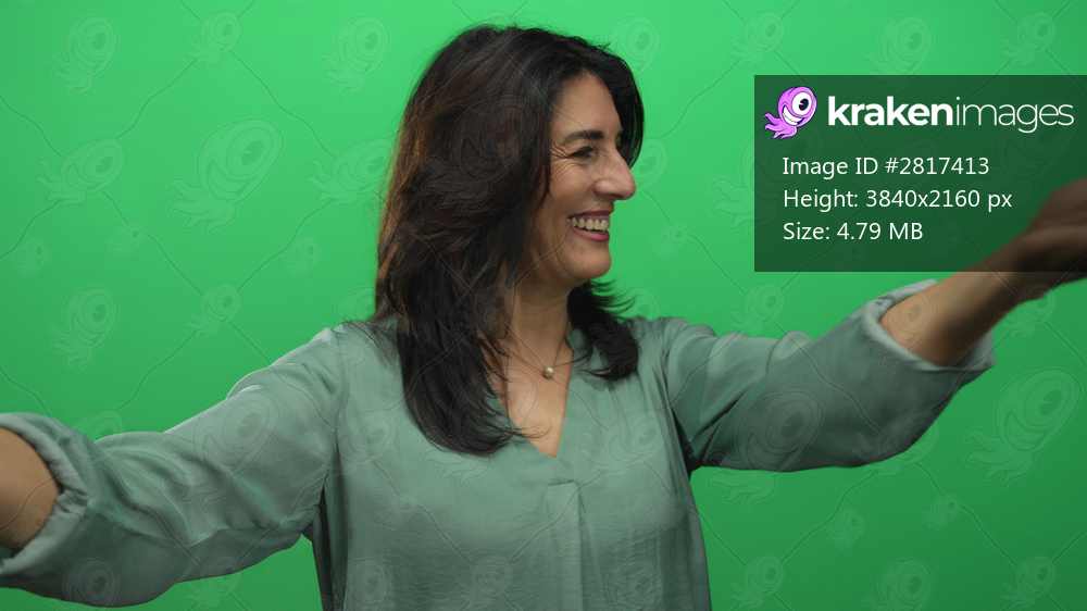 Woman in green blouse smiles while extending her arm and placing hand on chest against a bright green studio wall; joy.
