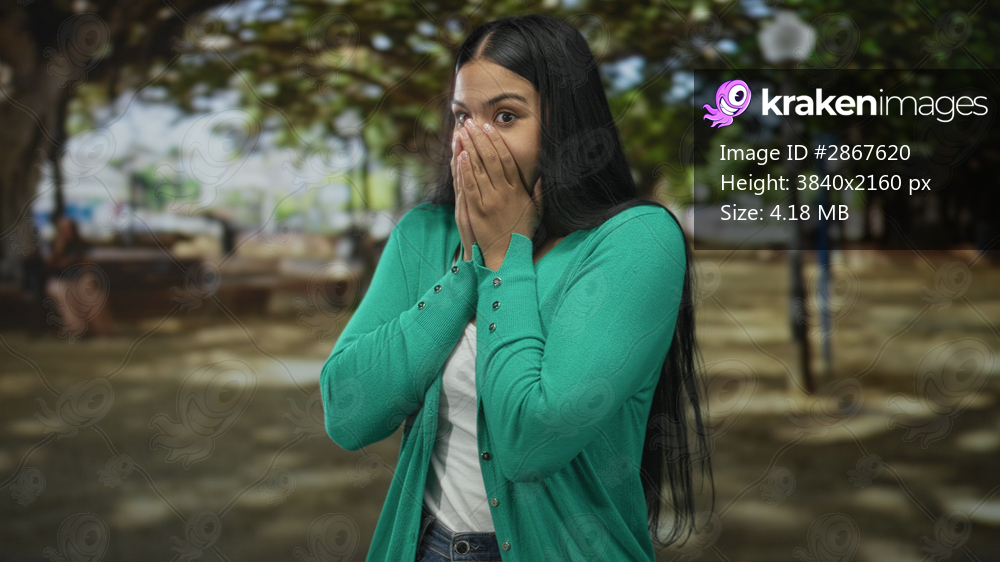 Woman in green cardigan covers mouth with both hands in a sunlit outdoor park setting; astonishment.