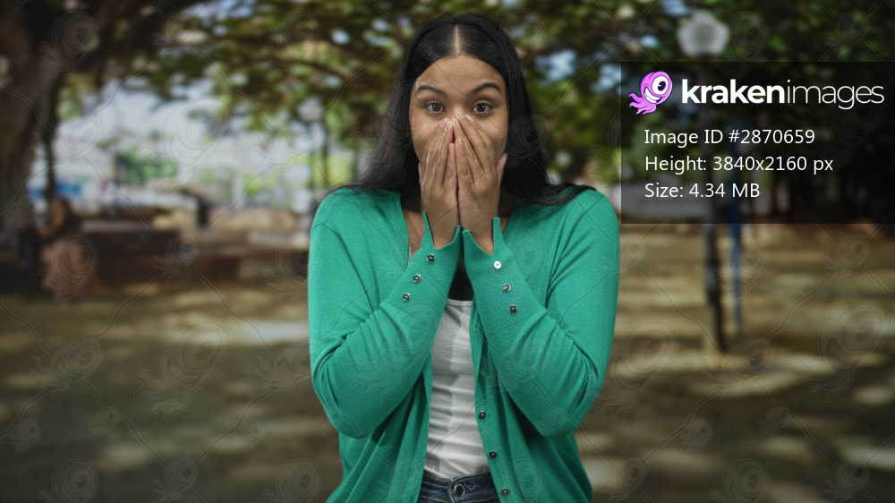 Woman in green cardigan covers mouth with both hands in a sunlit outdoor park setting; astonishment.