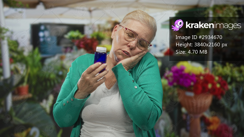 Woman in green cardigan and glasses holding blue bottle hand to cheek in flower market stall under canopy; sleepiness relief self care.
