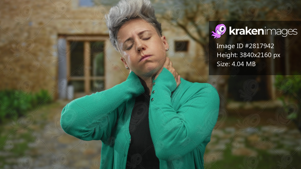 Woman in green cardigan holding her neck in front of stone building entrance on a cobblestone courtyard outdoors; discomfort.
