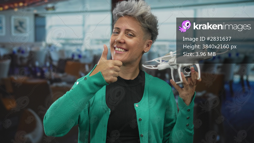Woman in green cardigan holds a white drone with hand and shows approval gesture in building; confidence innovation.