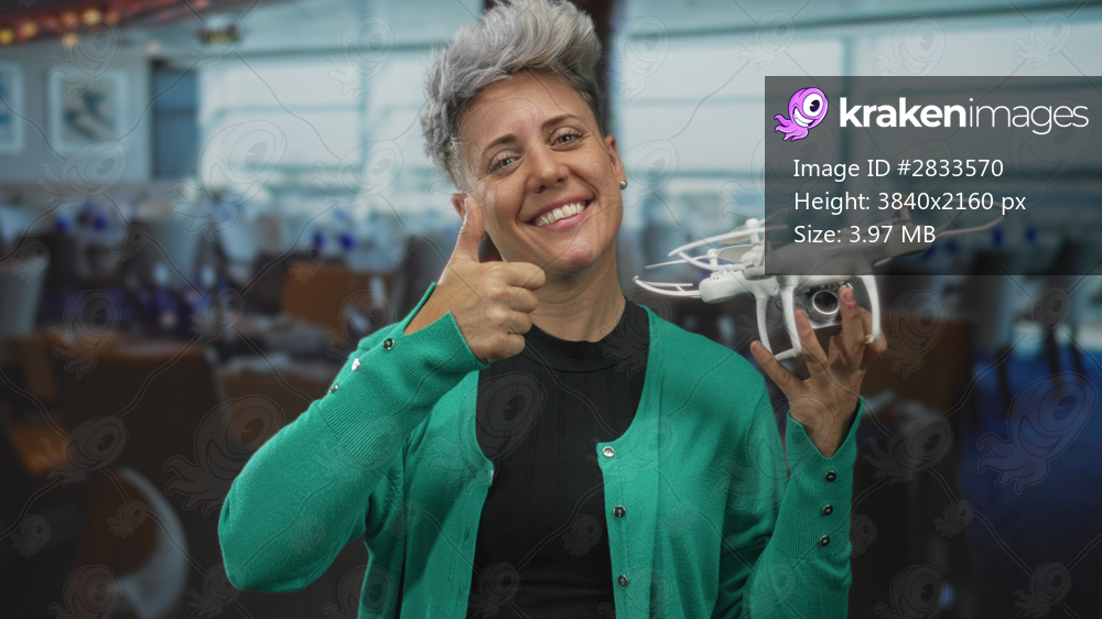 Woman in green cardigan holds a white drone with hand and shows approval gesture in building; confidence innovation.